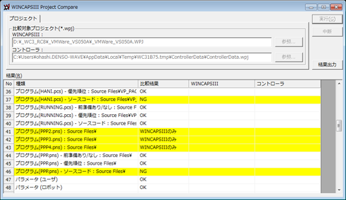 WINCAPSIIIで現在開いているプロジェクトとコントローラのデータを比較し、結果を別ウィンドウに一覧表示します。