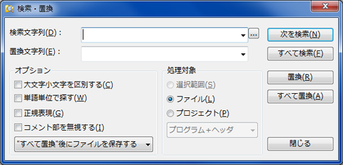 いろいろな検索方法を指定できます。 また、「すべて置換」を実行したときのファイルの処理を選択できます。