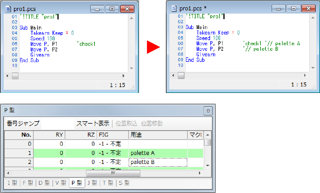 I/Oおよび変数の用途説明を変更した場合も再度コメント付加すると、「'//」以降が更新されます。