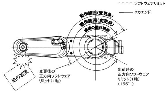 ロボットが他の装置と干渉する場合、下図に示すように、ソフトウェアリミットを変更して、動作範囲を狭くしてください。
