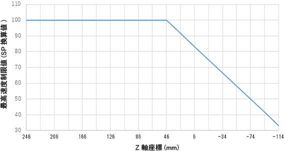 たとえば、床置き設置タイプのHSシリーズロボットにおいて、動作開始位置のZ軸座標 26mm、動作終了位置のZ軸座標 -74mmの場合、SP100で運転するときの最高速度制限値はZ軸座標 26mm のとき 91、Z軸座標 -74mm のとき 50となり、このとき最高速度は、値の小さい方(最下降端時)の50となります。