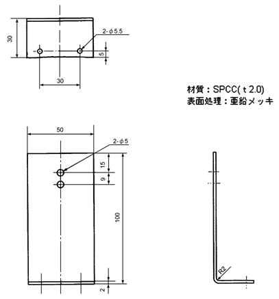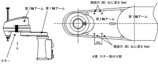 配線・配管用のステーをロボット本体に取り付ける場合は、第2軸アーム底面の4個の既設ねじ穴を利用し、必ず2本以上のねじで固定してください。この場合、下図を参考にしてステーを製作してください。