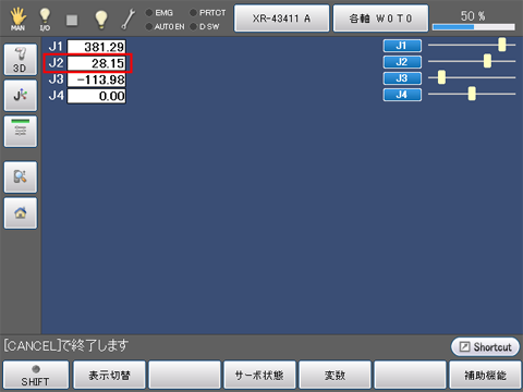 第2軸(R軸)をティーチングペンダントで動かし、12°~78°の位置に移動します。