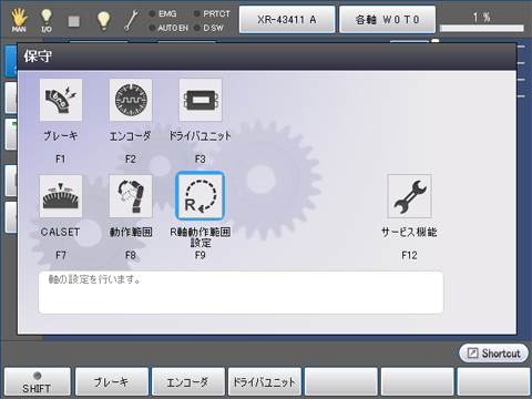 ティーチングペンダントの基本画面より、[F2 アーム]-[F12 保守]を押すと「保守」ウィンドウが表示されます。