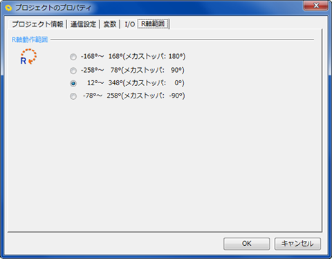 動作範囲は「第2軸(R軸)メカエンドの変更」を参考にして選択してください。