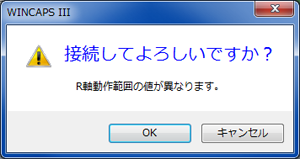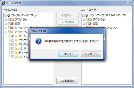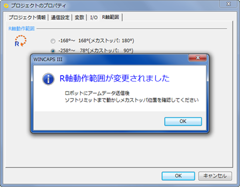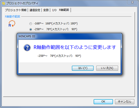 ロボットコントローラのR軸動作範囲とWINCAPSIIIのプロジェクトのR軸動作範囲のデータが異なるので確認のメッセージが表示されます。