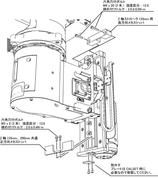 Z軸を手で動かさないでください。 正方向のメカストッパを取付けると、取付けられていたプレートがあまります。このプレートはCALSET時に必要なプレートですので紛失しないでください。