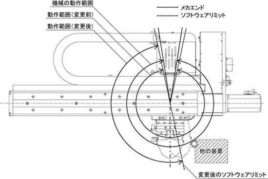 ソフトウェアリミットの変更を行う際は、必ずメカストッパの位置を確認して、メカストッパと衝突せずに動作するよう設定を行ってください。