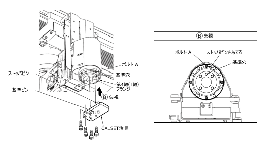 第4軸(T軸)または全軸のCALSETを行う場合、あらかじめCALSET治具を、以下に説明する手順で取付けてください。