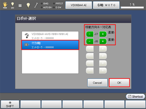図の例では、7軸は、ペンダントの[+ J1 X] [- J1 X]で動作させます。