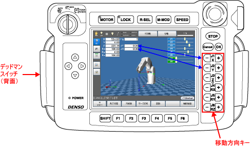 デッドマンSW連動機能により、デッドマンSWを押した時または、離した時のモータ電源ON・OFFを設定することができます。また、[移動方向表示キー表示]をONに設定すると、デッドマンSWを押した時に、移動方向を表すキーが画面右側に表示されます。