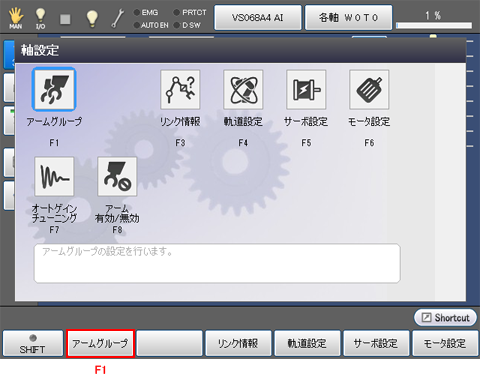 基本画面 - [F2 アーム] - [F12 保守] - [F10 軸設定] - [F1 アームグループ]を押します。