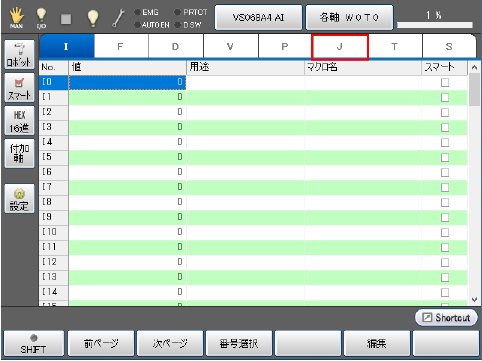 基本画面 - [F3 変数] - [J型変数]タブを選択します。