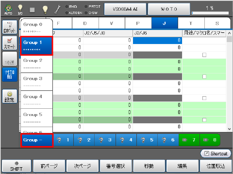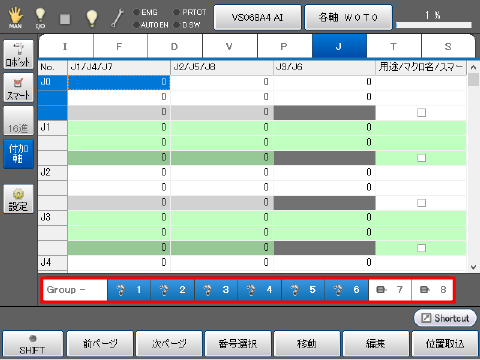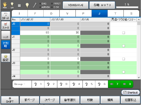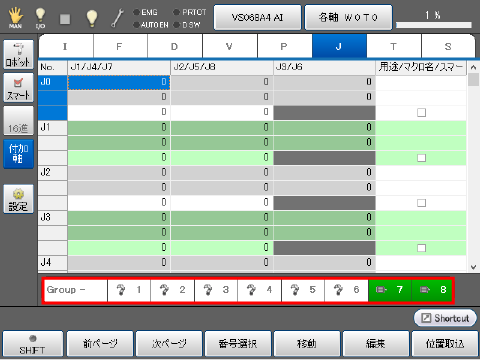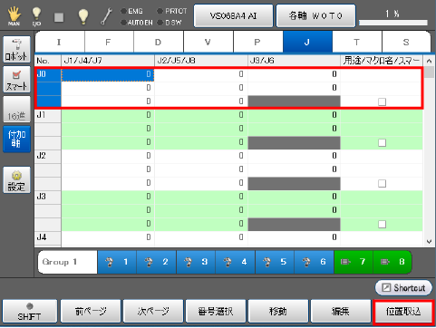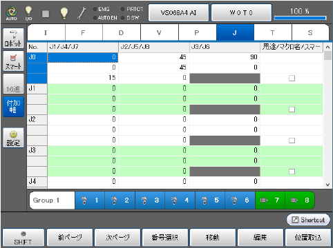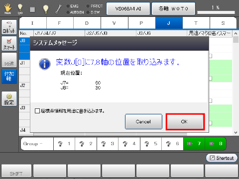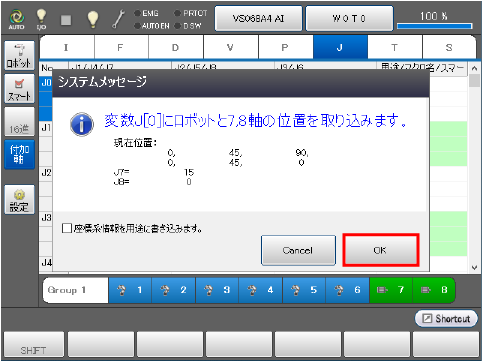目標位置を取り込む際に、ロボット軸と付加軸を同じアームグループに登録することで、ロボット軸と、付加軸の現在位置をJ型変数の同じ変数番号に同時取込みができます。