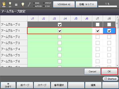 以下の例は、アームグループ1に"J1~J6"と、"J7、J8"を設定しています。