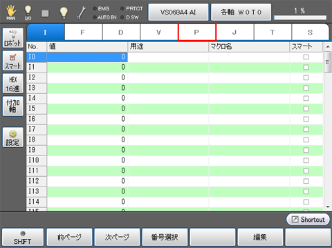 基本画面 - [F3 変数] - [P型変数]タブを選択します。