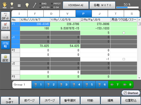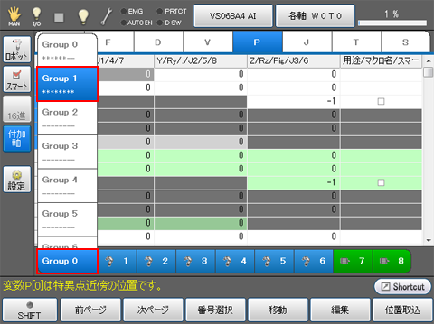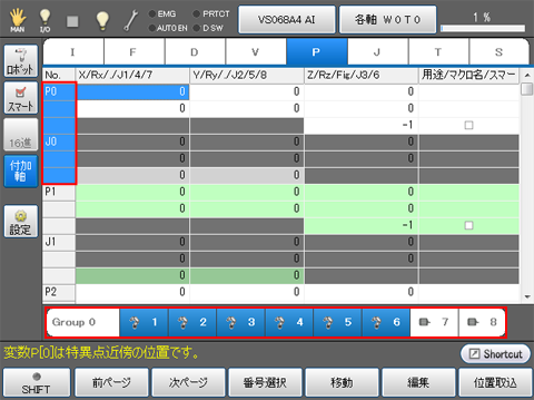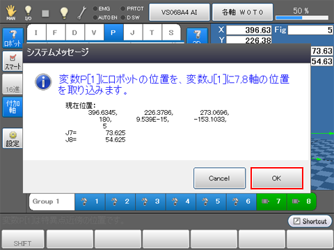 目標位置を取り込む際に、ロボット軸と付加軸を同じアームグループに登録することで、ロボット軸の現在位置をP型変数に、付加軸の現在位置のみをJ型変数の同じ変数番号に同時取込みができます。