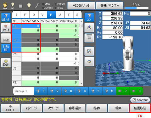 位置を取込む変数を選択し、[F6 位置取込]を押します。