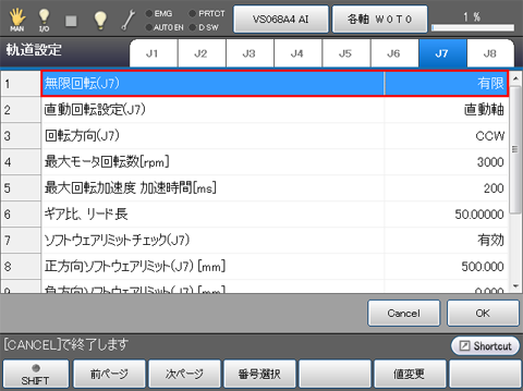 [軌道設定パラメータ]の無限回転設定を[無限]にします。詳しい設定方法は、「軌道パラメータの設定」を参照してください。