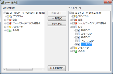 WINCAPSIIIのデータ送受信機能にて、サーボログを受信してください。