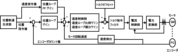 サーボ系は3つのフィードバック系(位置ループ、速度ループ、電流ループ)から成り、内側のループ程、応答性を高くする必要があります。内側のループが外側のループに対し十分高い応答性を確保しないと、応答性が劣化し振動的になります。