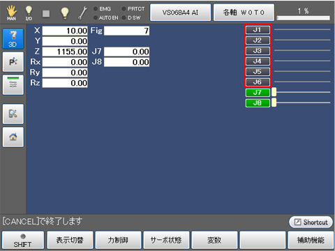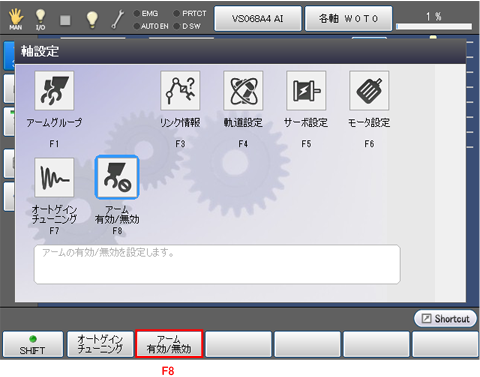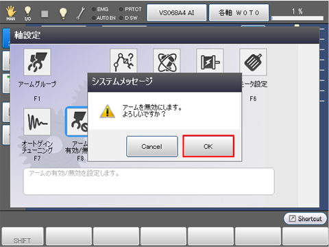 アームを有効にする場合は、STEP1の手順で「軸設定」画面を表示し、STEP2と3の要領で[アーム有効/無効]ボタンを押し、[OK]を押します。