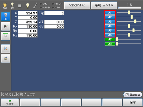 「ロボットの現在位置情報」画面の位置情報バーが、アーム有効状態を示す青色で表示されていることを確認します。