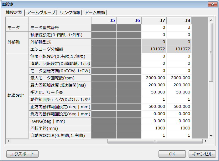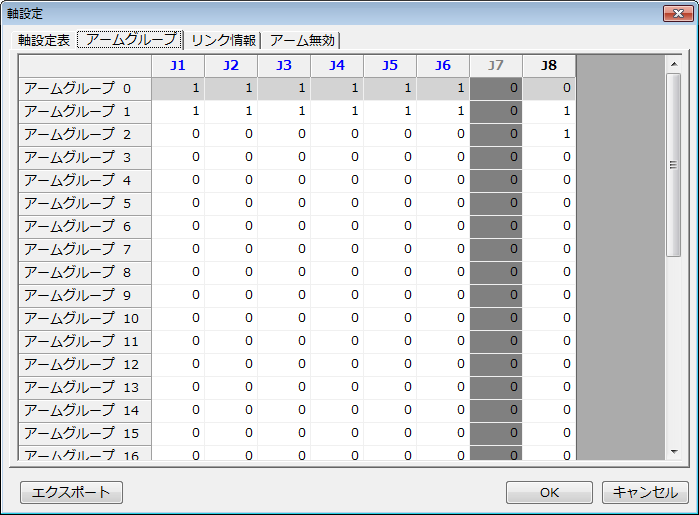 ロボット軸と付加軸をプログラムで動作させるためのアームグループを設定します。