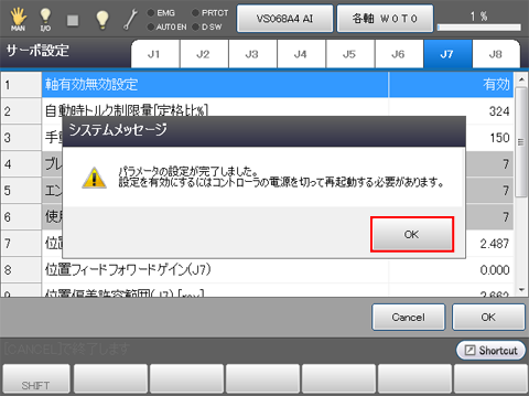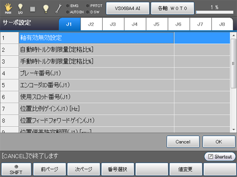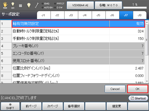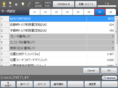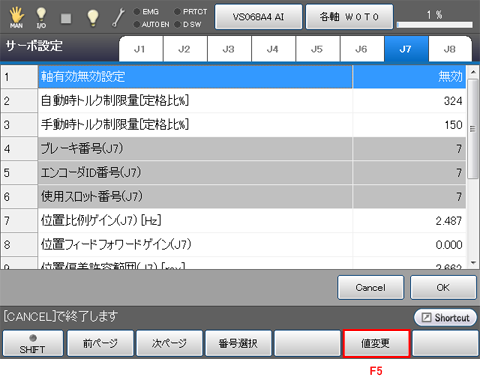 操作経路: [F2 アーム]-[F12 保守]-[F12 軸設定]-[F5 サーボ設定]