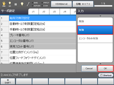 [軸有効無効設定]の表示が、[有効]になっていることを確認し、[OK]を押します。