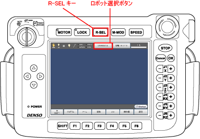[R-SELキー]または、[ロボット選択]ボタンを押します。