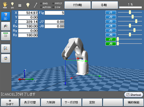 付加軸を手で押すと、「ロボット現在位置情報」画面のロボット現在位置が変化します。