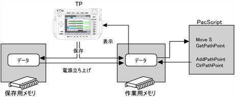 作業用メモリ内のデータには、ティーチングペンダントで編集できるものがあります。編集を行ったデータは、同時に保存用メモリにも保存されます。編集を行わず、参照しただけのデータは、保存用メモリには保存されません。