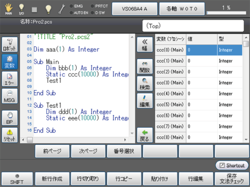 | 一行 | 実行行の変数を表示します。グローバル変数も表示します。 | |