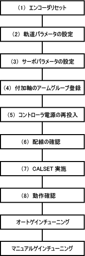 「軌道パラメータの設定」、「サーボパラメータの設定」、「付加軸のアームグループ登録」にて変更または、登録した設定を有効にするために、コントローラの電源を再投入します。