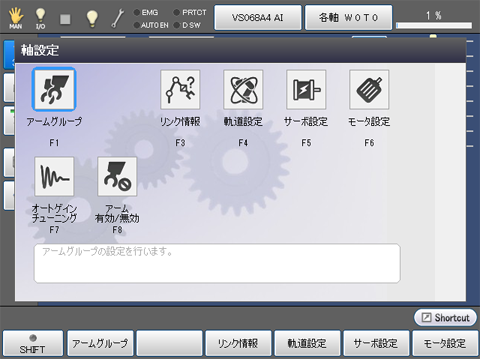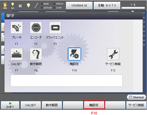 基本画面 - [F2 アーム] - [F12 保守] - [F10 軸設定]を押します。