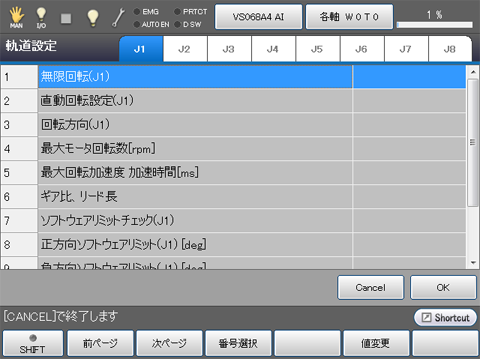 「軸設定」画面 - [F4 軌道設定]を押して、次のような「軌道設定」画面を表示します。