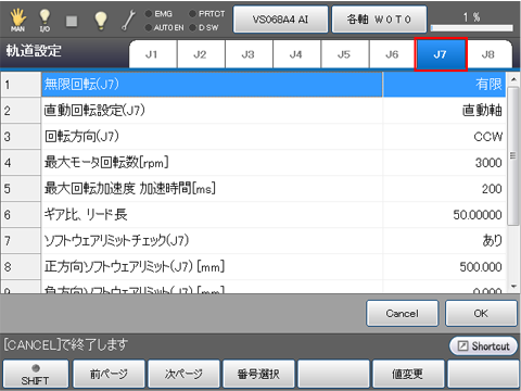付加軸の動作条件(速度、加速度、可動範囲など)を設定します。