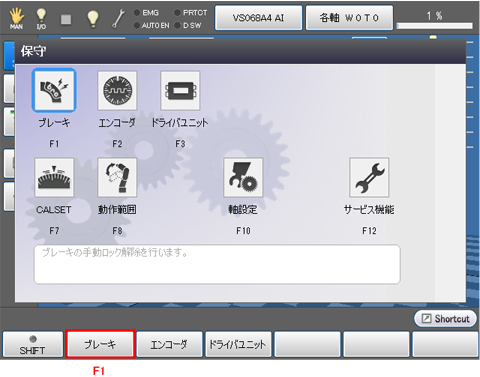 基本画面 - [F2 アーム] - [F12 保守] - [F1 ブレーキ]を押します。