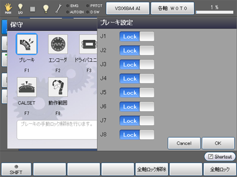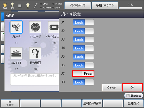 STEP1の手順で「保守」画面を表示し、STEP2の要領でブレーキ解除した軸を"Free"から"Lock"に変更し、ティーチングペンダントの[OK]キーを押します。