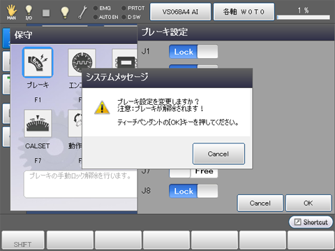 ブレーキ設定を変更するかのシステムメッセージが表示されますので、よければティーチングペンダントの[OK]キーを押します。