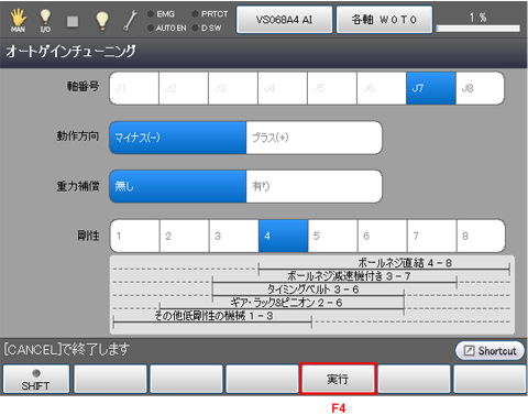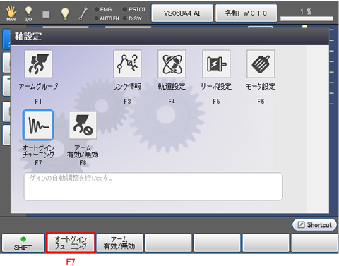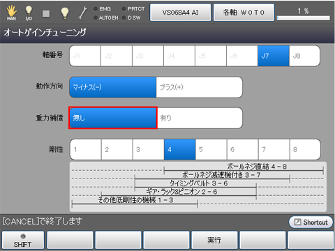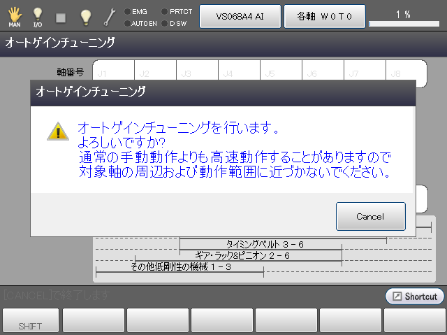 - オートゲインチューニング動作中にペンダントのキーを押すと、オートゲインチューニング動作は中断されます。オートゲインチューニング動作中は、その他のキーを押さないようにご注意ください。
