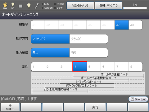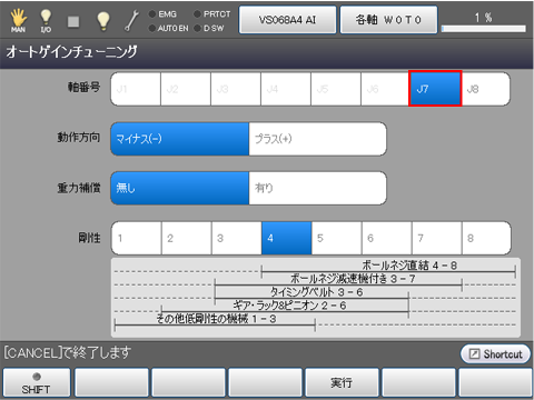 剛性が低い機械に高剛性を選択したり、逆に剛性が高い機械に低剛性を選択すると、オートゲインチューニング中にエラーが発生する場合があります。この場合は、剛性を変更し、再度オートゲインチューニングを実施してください。