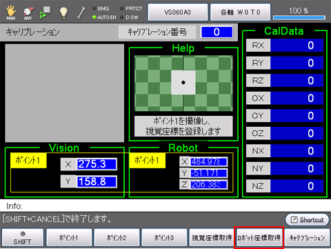 カメラでポイント1を撮像し、座標を読取ります。読取った座標を次の手順で入力します。