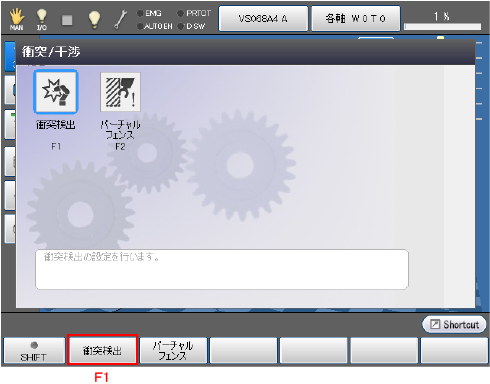 基本画面-[F2 アーム]-[F6 補助機能]-[F2 衝突/干渉]-[F1 衝突検出]を押します。