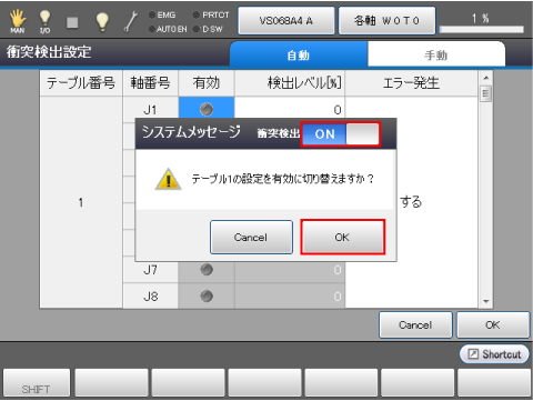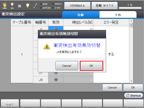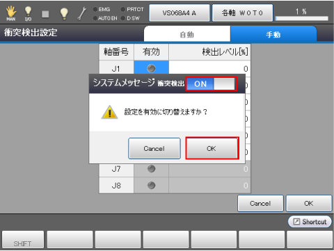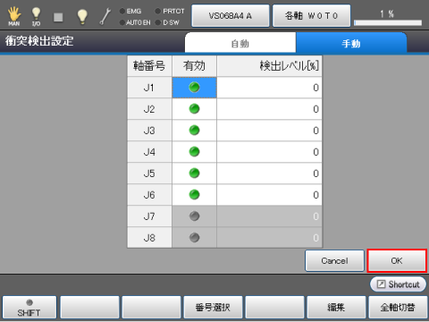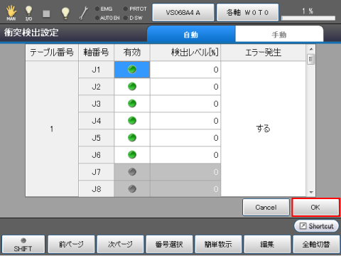 なお、[衝突検出]が[OFF]になっている場合に、[OK]を押すと全軸が無効になります。