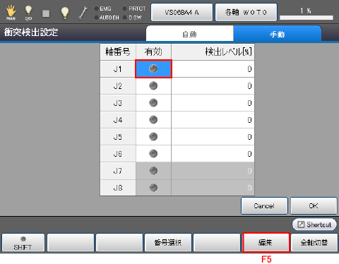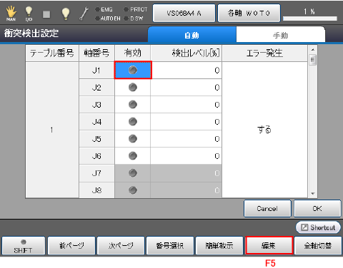 衝突検出機能を有効にする軸番号を選択し、各軸番号の[有効]または[F5 編集]を押します。