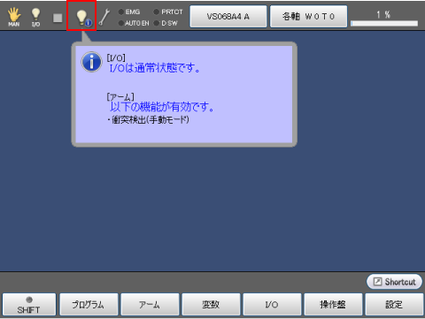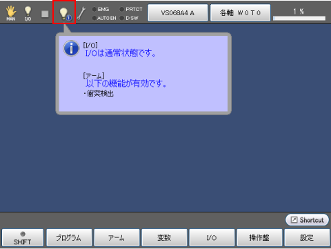 ティーチングペンダント上部のアーム状態を示すアイコンをタッチすると、有効状態が確認できます。