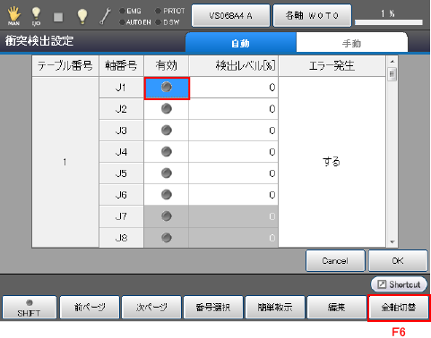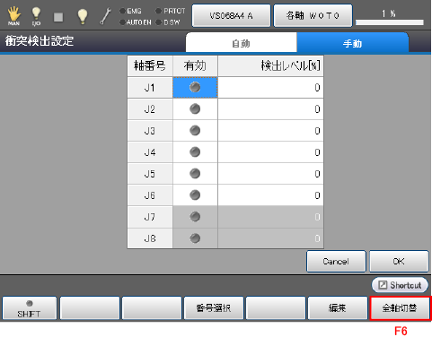 衝突検出機能を有効にする軸番号を選択し、[F6 全軸切替]を押します。