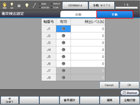 基本画面-[F2 アーム]-[F6 補助機能]-[F2 衝突/干渉]-[F1 衝突検出]-[手動タブ]を選択します。